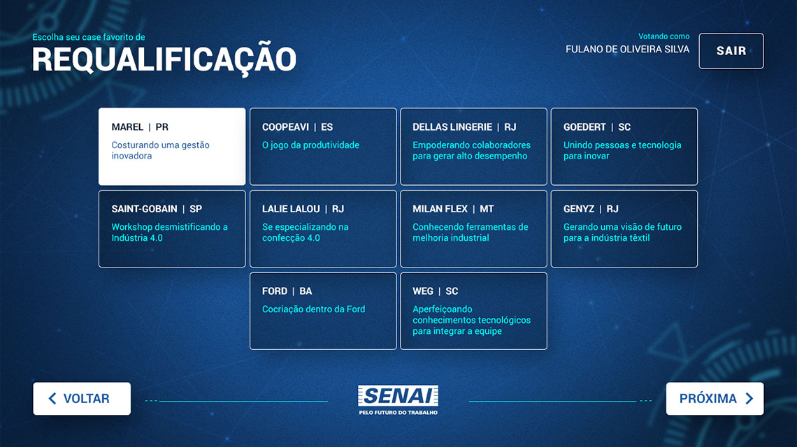 Para realizar uma votação entre cases apresentados pelas empresas no congresso, também desenvolvemos um aplicativo para os participantes do evento votarem em seus cases favoritos em 4 categorias. Os resultados parciais foram transmitidos em tempo real para os telões do evento.