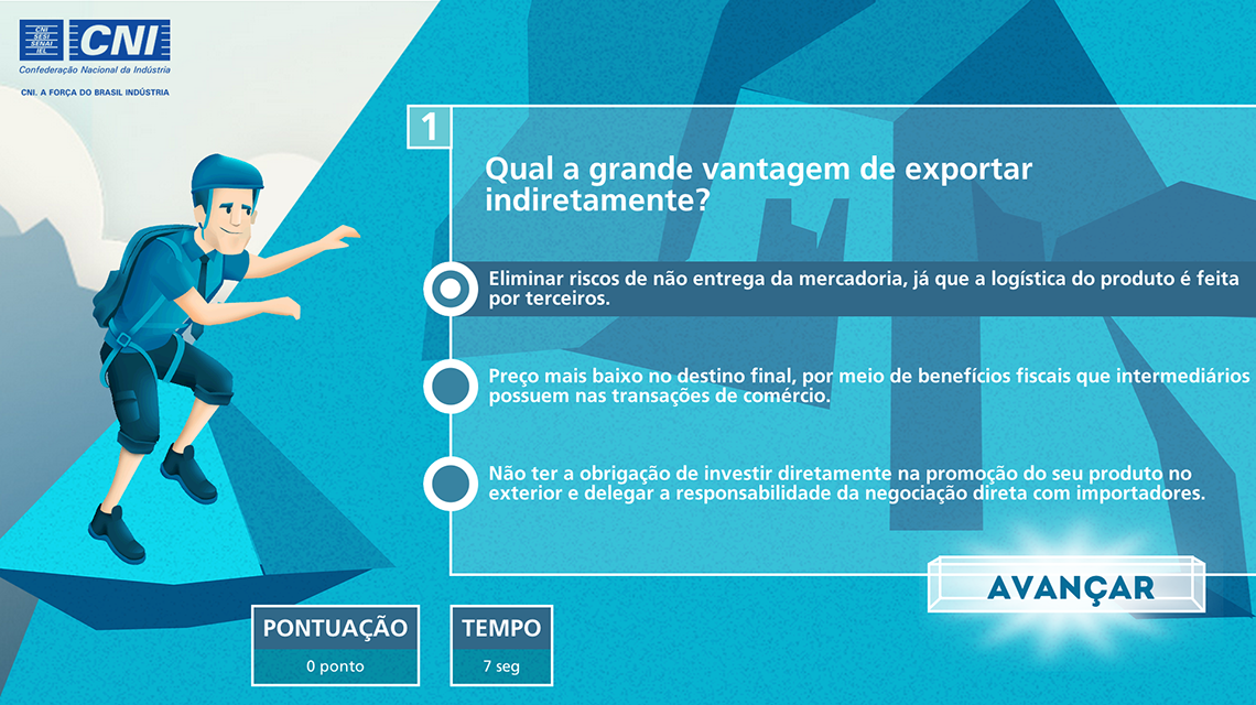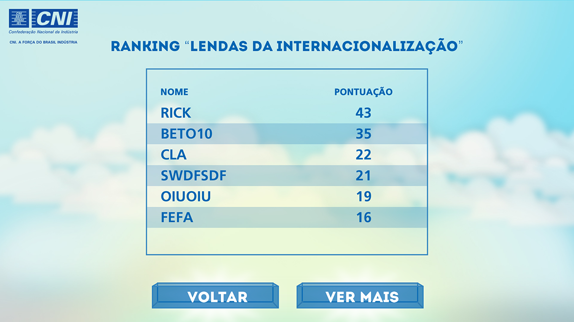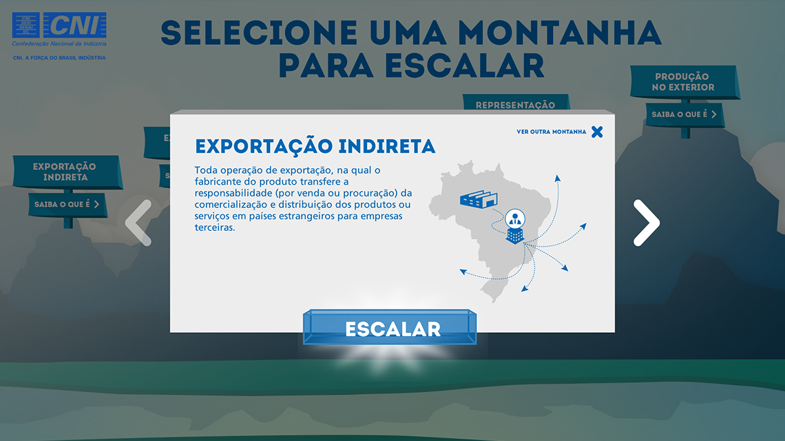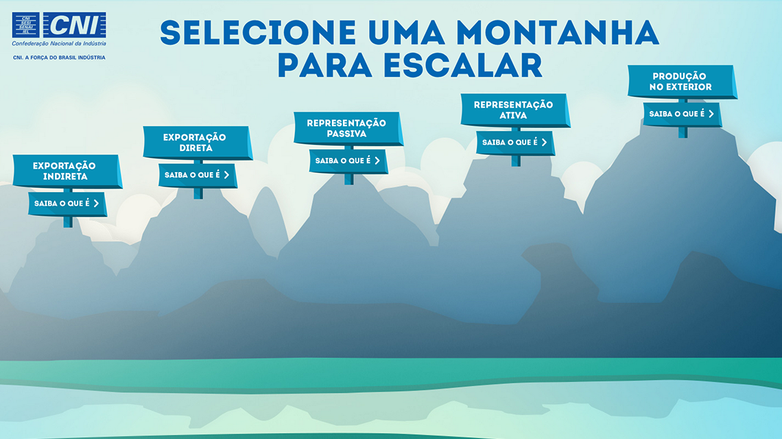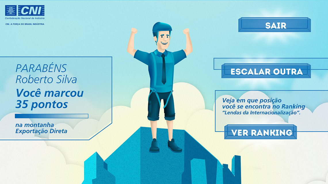 Com o objetivo de disseminar informações sobre as possibilidades de internacionalização de empresas, criamos um jogo para o estande da CNI no Enai 2013 – Encontro Nacional das Indústrias. Em parceria com a Capacità Eventos, desenvolvemos para uma tela touchscreen um quiz dividido em níveis que, a medida que o usuário avançava, seu avatar masculino ou feminino ia escalando uma montanha. Ao final de cada nível, as pessoas podiam seguir adiante na escalada ou conferir suas posições no ranking geral do jogo.